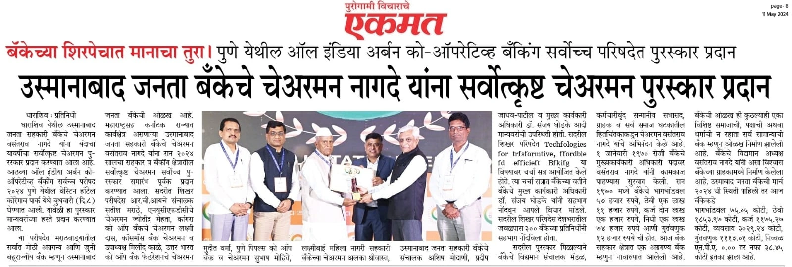 आठव्या ऑल इंडीया अर्बन को-ऑपरेटीव्ह बँकींग सर्वच्च परीषद २०२४ पुणे, येथील वेस्टिन हॅाटेल कोरेगाव पार्क येथे दिनाक 0८-०५-20२4 रोजी आयोजीत करणयात आलेत्या परीष्देत मराठवाड्यातील सर्वात मोठी अग्रगन्य आणि जुनी बहूराज्यीय बँक म्हणून ओळखल्या जाणा-या व महाराष्टृसह कर्नाटक राज्यात कार्यक्षेत्र असणा-या उस्मानाबाद जनता सहकारी बँकेचे चेअरमन सहकारमहर्षी मा.श्री.वसंतराव नागदे साहेब यांना साल-सन 2024 सालचा सहकार व बँकींग क्षेत्रातील सर्वोत्कृष्ट चेअरमन सर्वोच्च पुरस्कार समारंभ पुर्वक प्रदान करण्यात आला.